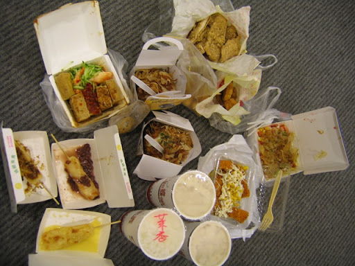 It only took about four days. We managed the route by ourselves. We wanted to eat a lot of delicious food, so we named this trip as "Pigs-Feeding". But actually we still visited many museums in this trip. At the first day, we bought our dinner at a famous night market that is near a university in Taichun. The food in the picture was our dinner, and some food was already finished on the way.
